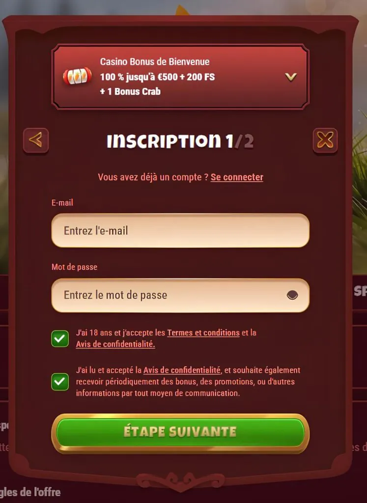| Bonus de bienvenue | 500€ + 200 tours gratuits + 1 bonus crab sur votre premier dépôt |