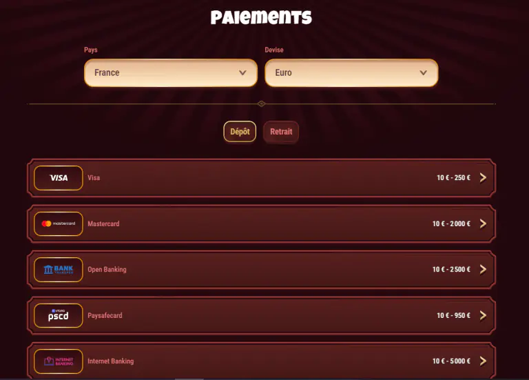 Déposer de l’argent sur Magius Casino France est très simple. En France, le minimum que vous pouvez déposer est de 10€ et le dépôt maximum est de 5000€. Vos transactions sont protégées par les logiciels de la plateforme. La durée de réception des fonds sur votre compte est comprise entre quelques minutes à des deux jours ouvrables. Le processus est le suivant.